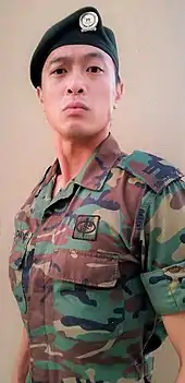In all service branches, the beret is "bashed" to the right, and a badge or insignia is worn above the left eye. In the army, all units can wear them, with certain units wearing unique ones.[9] In the navy, the beret is an optional item,[10] and in the air force, it is only worn by certain units.[11]