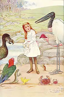 Sowerby was among the earliest women to illustrate Lewis Carroll's Alice's Adventure's in Wonderland, originally published in 1865.[3] In 1907, the book entered the public domain in the United Kingdom, and that year at least eight new editions were published, with Sowerby's being the first of the new lot to appear.[6] A collective review in The Academy of the 1907 editions – while regarding her rendition of the mad-hatter's tea party her best illustration, and Father William replying to his son her best use of color – opined "Sowerby attempts work rather too difficult for her, and she has not much imagination".[7] Her artwork in Childhood, written by her sister Githa, however, was regarded as "much better" than her work in Alice: "The bistre drawings have a charming effect, and [Sowerby] has a pretty fancy."[8]:217 Her illustrations of Robert Louis Stevenson's A Child's Garden of Verses were received as "characteristically excellent",[2] and a 1911 review of three books produced with Githa proclaimed "Millicent Sowerby is Kate Greenaway come to life again."[9]