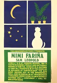 Fariña met novelist, musician, and composer Richard Fariña in 1963 when she was 17 years old and married him at age 18 in Paris.[2] The two collaborated on a number of influential folk albums, most notably, Celebrations for a Grey Day (1965) and Reflections in a Crystal Wind (1966), both on Vanguard Records. After Richard Fariña's death in 1966 (on Mimi's twenty-first birthday) in a motorcycle accident, Mimi moved to San Francisco where she flourished as a singer, songwriter, model, actress, and activist. She performed at various festivals and clubs throughout the Bay Area, including the Big Sur Folk Festivals, the Matrix, and the hungry i. Mimi briefly sang for the rock group the Only Alternative and His Other Possibilities. In 1967, Fariña joined a satiric comedy troupe called The Committee. That same year, she and her sister Joan Baez were arrested at a peaceful demonstration where the two were housed temporarily in Santa Rita Jail, personalizing the experience of captivity for her. In 1968, Mimi married Milan Melvin and continued to perform, sometimes recording and touring with either her sister Joan or the folksinger Tom Jans, with whom she recorded an album in 1971, entitled Take Heart. Mimi and Milan divorced in 1971.
