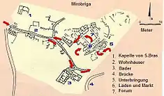 To the east of the baths is a small, single-arch bridge, that provided access along the west-east access that leads to the "forum", an Imperial temple (to worship the Roman Emperors) and a temple dedicated to Venus.[2][1] Between these two are the remains of an older temple dedicated to the local divinity. North of the forum are the ruins of the market and the visitor's houses, separated by another road.[2][1]