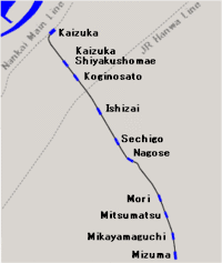 The Mizuma Line (水間線, Mizuma-sen) is a Japanese railway line between Mizuma Kannon Station and Kaizuka Station, all within Kaizuka, Ōsaka. This is the only railway line of a private railway company Mizuma Railway (水間鉄道, Mizuma Tetsudō) operates. The company also operates bus services.