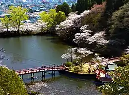A base for the 252 Air Group of the Imperial Japanese Navy (IJN), a fighter aircraft unit, was established in Mobara.[4] In 1941, by order of the IJN, 100 residences and their associated farmland, schools, town halls, police substations, temples, and shrines were forcibly confiscated without warning to build the base. Mobara Airfield was completed using a kinrō dōin group that consisted of the forced labor of Korean residents in Japan and students from Chōsei Middle School students in 1943. The airfield was located on the east banks of the small Aku River, directly to the east of Mobara Station along the present-day JR East Sotobō Line, and consisted of a runway and 20 structures, some of them concealed underground. Tokubetsu kōgekitai, or kamikaze units, were sent from Mobara Airfield to the IJN Kokubu Air Corps in present-day Kirishima, Kagoshima Prefecture to attack American forces off Okinawa. The United States confiscated the airfield shortly after the surrender of Japan in 1945. Remains of the runway, approximately ten airfield structures, and a tunnel are now on the property of the Mitsui Chemicals.[5][6]