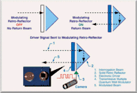 In a typical optical communications arrangement, the MRR with its related electronics is mounted on a convenient platform and connected to a host computer which has the data that are to be transferred. A remotely located optical transmitter/receiver system usually consisting of a laser, telescope, and detector provides an optical signal to the modulating retro-reflector. The incident light from the transmitter system is both modulated by the MRR and reflected directly back toward the transmitter (via the retroreflection property). Figure 1 illustrates the concept.[1]