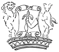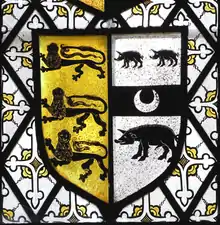 - Nicholas IV Carew (1424–1470), son and heir apparent, who married Margaret Dynham (d.1471), a daughter of Sir John Dynham (1406–1458) of Nutwell in the parish of Woodbury and of Hartland, both in Devon, and a sister and co-heiress of John Dynham, 1st Baron Dynham (c. 1433–1501),[60] Lord High Treasurer of England and Lord Chancellor of Ireland. Her mother was Joan Arches (died 1497), sister and heiress of John Arches and daughter of Sir Richard Arches (died 1417), a Member of Parliament for Buckinghamshire in 1402, of Eythrope, Cranwell (both in the parish of Waddesdon) and Little Kimble, Buckinghamshire.[61] The purbeck marble chest tomb of Nicholas IV Carew survives in the Chapel of St Nicholas in Westminster Abbey, the ledger stone of which bore a Latin inscription, now effaced. The Devonshire biographer Prince (d.1723) wrote concerning this monument "To whose memory an antient plain tomb of gray marble is there still seen erected with an inscription in brass round the ledg, and some coats of arms on the pedestal".[62] The inscription and arms were still remaining in 1733, but had disappeared by 1877.[63] The Latin epitaph was recorded by Prince as follows:[64]