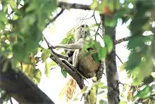 The park is home to over 93 mammal species, and the large mammals of the park include an elephant population, hippos, buffalo, and warthogs.[13][14] The park is considered a primary African preserve for antelope species including kob, defassa waterbuck, roan, hartebeest, oribi, the bushbuck, and two duikers, the red duiker and yellow-backed duiker.[4][13][14][15][16] Olive baboons, black-and-white colobus monkeys, the green vervet, and patas monkeys are the known species of monkeys resident in the park.[13] Of the 33 known species of reptiles slender-snouted and dwarf crocodile are found in the park.[1][13][14] Sightings of hyenas, lions and leopards are unusual, but these carnivores were once more common in the park.[14] Among the 344 listed bird species are the martial eagle, the white-headed and palm-nut vultures, saddle-billed storks, herons, egrets, the Abyssinian roller, the violet turaco, various shrikes and the red-throated bee-eater.[1]