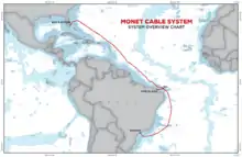 The MONET cable system is a subsea fibre optic telecommunications cable scheduled to be deployed at the end of 2016. Delays in the execution bring the conclusion to December 2017. It will connect the cities of Santos and Fortaleza in Brazil with Boca Raton in the United States.[1][2]