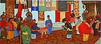 Xu returned to Beijing, where he received a hero's welcome arranged by the Anhui clique. By December, he was back in Urga to organise a formal ceremony for the transfer of authority: soldiers were lined up on either side of the road to the Bogd Khan's palace; the portrait of the President of China was borne on a palanquin; the flag of the Chinese republic followed, and after it a marching band. Mongols were required to prostrate themselves repeatedly before these symbols of Chinese sovereignty.[15] That night, some Mongolian herdsmen and lamas gathered outside the palace and tore down the flags of the Chinese Republic hanging from the gate.[16]