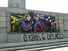 On June 17, 2011 the monument was painted overnight by a group of anonymous artists who call themselves Destructive Creation[1] and who "dressed" the Soviet Army soldiers as the American popular culture characters: Superman, Joker, Robin, Captain America, Ronald McDonald, Santa Claus, Wolverine, The Mask, and Wonder Woman. A caption was painted underneath which translates as "In pace with the times" (in Bulgarian "V krak s vremeto").[2][3]