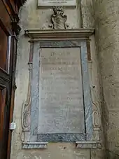 The monument on the last pillar of the north aisle was dedicated to Camilla Buonvisi from Lucca by his husband, Vincenzo Parenzi. It is made of coloured marbles. The stone plaque is decorated with the Parenzi-Buonvisi coat-of-arms in the gable and the skull and crossbones at lower part. There is a winged cherub above the escutcheon. The long inscription states that Parenzi, a consistorial advocate "has lived with her for thirty years in a variety of events, yet without the least breach or interruption of perfect harmony". The noble lady died in 1579 at the age of 53 years.[7]