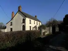 Higher Moorhayes Farm is a grade II listed building, possibly incorporating a 15th century core structure, extensively remodelled in the 19th century. It incorporates fragments of a medieval chapel, which identifies it as the residence of a family of high social status. The earliest surviving dateable feature is of the late 16th century. It is essentially a three-room "cross-passage" house, with the original great hall on the higher side to the right of the screens passage, originally with a fireplace at the higher end. The entrance porch retains a (worn-away) sculpted heraldic shield in the apex, with a reset medieval arch probably taken from the chapel. In the lower end room survives a fireplace with a decorative plaster overmantel displaying festoons and a central lion's head which could be late 16th century, now heavily painted. In the stairwell window survive fragments of late 15th or early 16th century painted glass canopy work, probably from the chapel. The gateway to the garden incorporates re-used medieval material including piers and finials with a lintel with composite roll and concave moulding.[1]