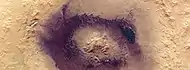 Impact craters generally have a rim with ejecta around them, in contrast volcanic craters usually do not have a rim or ejecta deposits. As craters get larger (greater than 10 km in diameter) they usually have a central peak.[3] The peak is caused by a rebound of the crater floor following the impact.[4] Sometimes craters expose layers that were buried. Rocks from deep underground are tossed onto the surface. Hence, craters can show us what lies deep under the surface.