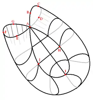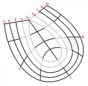 Section East has, considered just by itself, one loop of double points: AHIJA. If the surface is unwound and flattened the result will be the following: