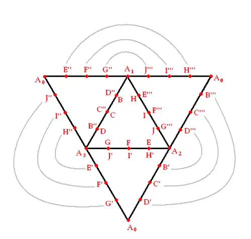 The diagram shows section East bounded by three loops: ABCDA, AEFGA, and AHIJA. The third loop, AHIJA, is a line of double points where section East intersects with itself. Loop ABCDA is only a line of double points when section East is joined to section West, and loop AEFGA is only a line of double points when section East is joined to section South. Point is the quadruple point which is actually the overlapping of four different points: A0, A1, A2, A3.
