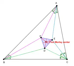Let DEF be the Morley triangle of triangle ABC. The centroid of triangle DEF is called the first Morley center of triangle ABC.[1][3]