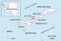 ![]() Location of Aitcho Islands in the South Shetland Islands. | |