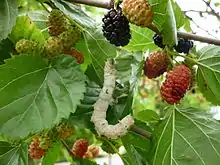 Mulberry leaves, particularly those of the white mulberry, are ecologically important as the sole food source of the silkworm (Bombyx mori, named after the mulberry genus Morus), the cocoon of which is used to make silk.[17][18] The wild silk moth also eats mulberry.[19][20] Other Lepidoptera larvae—which include the common emerald, lime hawk-moth, sycamore moth, and fall webworm—also eat the plant.[21]