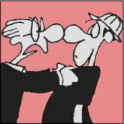 During Abel and Buffy's visit, Mabel had to have a formal outfit in reserve for Mike in order to give off an illusion of expensive taste in apparel.[1][17] This one-time gag appeared on the August 28, 1997 episode of the comic strip; the visit took place on a leisurely Thursday afternoon.[1][17] Mike was chosen to wear an effeminate white tie outfit consisting of a black jacket, white bow tie, white tuxedo shirt, white vest and black formal trousers for Abel and Buffy's visit. The effeminate outfit somehow got a flaw in it from Mike struggling to get it on; making him look like a fool in front of his in-laws.[17] After the visit is over, even his wife Mabel is glad to see her brother and his wife leave the house. She is lying down in the couch all exhausted because Abel and Buffy were acting in a hyperactive manner throughout the house.[12]
