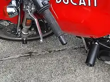 Various kinds of sliders, called frame sliders, frame protectors, fairing protectors, or crash bobbins, are attached to motorcycles with the intention of minimizing damage to the bike's fairings, frame, engine, and other parts, in the event of a crash, or an accidental tip over. They are made of plastics, such as Delrin, acetal, or nylon, or sometimes aluminum. Frame sliders are usually located and installed on the engine bolts on both sides of the fairings.[7][8][9] Front or rear axle sliders, also called fork sliders and swing-arm spool sliders provide some potential damage reduction for the suspension components, wheels, and other parts by making contact with the ground before the rest of the bike. Hard-mounted foot pegs, which do not fold upward can also serve as a buffer between the ground and the bike's frame and components.[10]
