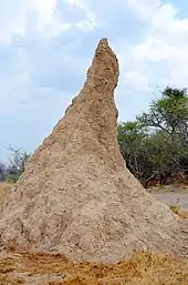 Vegetation on termite mounds usually differs highly from vegetation in the surrounding.[8][9] In African savannas, Macrotermes mounds form 'islands' with high tree densities. This is usually attributed to the fact that due to the digging of termites and due to their decomposition of plant material, the mound soils are generally more fertile than other soil. On top of that, mound soils have been found to contain more water than their surroundings, a clear advantage for plant growth in savannas.[10] The high tree densities on termite mounds attract high densities of browsing herbivores, due to the high nutrient contents in foliage from trees growing on mounds,[11][12] or perhaps due to the high quantities of food and shelter on mounds.[9]