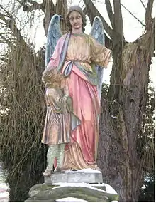 The church of Moutfort is catholic, like almost everyone in Luxembourg used to be. Medingen has just a little church designated as chapel, although there is space for many people. The Guardian Angel on the main road is standing in a little parc beside a chapel that's bigger than most such chapels on the way, but not meant to go inside. At the traditional Corpus Christi procession which marches around the village on the central streets in the shape of a square, this chapel is always being decorated with flowers and flags, in old times also with a carpet of flowers in front of it, and the procession stops there for special prayers and songs.