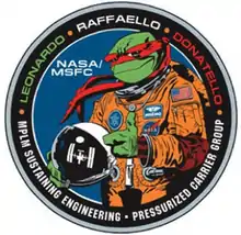 Since the module names are also the names of three of the four Teenage Mutant Ninja Turtles, the NASA MPLM Group approached Mirage Studios (Teenage Mutant Ninja Turtles) artist A.C. Farley to design a logo with a ninja turtle in an astronaut flight suit.[4] There were cloisonné pins produced, as well as stickers and embroidered patches. There are supposed to be mission jackets using this design as well. Because the Ninja Turtles are copyrighted by Mirage Studios, NASA gave Mirage the copyright to the logo in exchange for the use of the studio's character on it.[4]