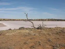 The Pink Lakes are medium-sized salt lakes. In late summer a red pigment, carotene, is secreted from the alga Dunaliella salina and gives a distinct pink colour to the lakes.