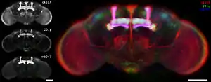 The mushroom bodies or corpora pedunculata are a pair of structures in the brain of insects, other arthropods, and some annelids (notably the ragworm Platynereis dumerilii).[2] They are also known to play a role in olfactory learning and memory. In most insects, the mushroom bodies and the lateral horn are the two higher brain regions that receive olfactory information from the antennal lobe via projection neurons.[3] They were first identified and described by French biologist Félix Dujardin in 1850.[4][5]