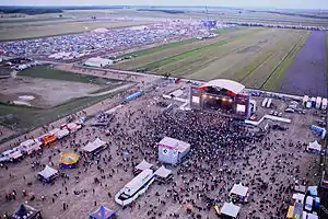 Milwaukee, Wisconsin's 11-day event, Summerfest, promotes itself as "The World's Largest Music Festival." Operating annually since 1968, the festival attracts between 800,000 and 1,000,000 people each year, and hosts over 800 musical acts.[6] The Woodstock Festival in 1969 drew nearly 500,000 attendees, and the Polish spin-off Przystanek Woodstock in 2014 drew 750,000[7] thus becoming the largest open air annual festival in Europe and the second largest in the world. In comparison, the Roskilde Festival in Denmark, attracts about 135,000 spectators each year.[8] Glastonbury Festival has a capacity of about 275,000 spectators, but has "fallow years" roughly every five years, so it is the biggest non-annual greenfield festival in the world. The oldest annual dedicated pop music festival in the world is Pinkpop Festival in the Netherlands,[9] though in other genres, there are much older ones: the Three Choirs Festival in the UK has run annually[10] since 1719. The Queensland Music Festival, established in 1999 and headquartered in Brisbane Australia, is the largest music festival by land mass, as a state-wide music biennial music festival, over a three-week period during July.
