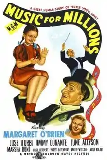 Music for Millions is a 1944 musical comedy film directed by Henry Koster and starring Margaret O'Brien, José Iturbi, Jimmy Durante, June Allyson, Marsha Hunt, Hugh Herbert, Harry Davenport, and Marie Wilson.[2][3] It was nominated for an Oscar for Best Original Screenplay in 1946.[4]