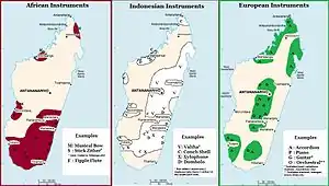 Instruments in Madagascar were brought to the island by successive waves of settlers from across the Old World.[9] Over 1500 years ago, the earliest settlers from Indonesia brought the oldest and most emblematic instruments, including the tube zither (valiha) which evolved into a box form (marovany) distinct to the island. Later settlers from the Arabian peninsula and the eastern coast of Africa contributed early lutes, whistles and other instruments that were incorporated into local musical traditions by the mid-16th century. The influence of instruments and musical styles from France and Great Britain began to have a significant impact on music in Madagascar by the 19th century.