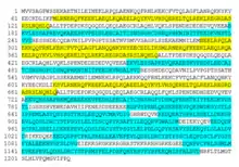 NBPF1 is a 1214 amino acid long protein in humans that weighs 139 kD and has an isoelectric point of around 5. A feature about this protein's composition is that it is much richer than most other proteins in both glutamine and glutamic acid residues. Additionally, it contains amino acid repeats that are present in humans, other primates, and even armadillos.[7] Another feature is that the NBPF1 protein contains residues that are predicted to have post-translational modifications, including glycation, N-linked glycosylation, O-GlcNAc attachment, O-linked glycosylation, Phosphorylation, and Sumoylation.[8] The two most important domain types in the NBPF1 protein are the coiled coil domains and DUF1220 domains. NBPF1 contains three coiled coil domains and nine DUF1220 domains in humans. The coiled coil domains are 60-100 amino acids long, while the DUF1220 domains are approximately 65 base pairs long with high sequence similarity.[9]