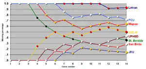 | 4 | 7 | 5 | .583[lower-alpha 1] | 4 | ||