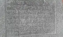 The vast majority of Nabataean inscriptions are found engraved on stone, like the Aslah inscription from Petra (95 BCE), the dedication to the goddess al-Kutba from Wadi Tumilat (77 BCE) and the inscription of Rabbel I from Petra (66 BCE).[12] Some excavations have unearthed inscriptions on metallic objects. Most of such inscriptions were inscribed on metallic coins. Excavations in Wadi Musa in southern Jordan, unearthed dozens of bronze fragments with Nabataean inscriptions on them, yet the source of these fragments is uncertain. An important bronze inscription is found on a bronze oil burner excavated in Wadi Musa with a dedication from a priest and his son to Obodas, which dates to the reign of the Nabataean king Rabbel II, ruling between the years 70-106 AD.[13]
