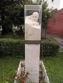 Pravda, the Communist Party newspaper, announced Alliluyeva's death in its 10 November edition. This came as a surprise to many in the Soviet Union, as it also was the first public acknowledgement that Stalin had been married. Her body, in an open casket, was placed in an upper floor the GUM department store, which was opposite Red Square and the Kremlin. Government and party officials came to visit, but the public was not allowed.[69] The funeral was held on 12 November, and only Vasily was present.[70] Stalin took part in the procession to the cemetery afterwards, which involved a 6 kilometres (3.7 mi) march from GUM to the Novodevichy Cemetery, though it is not clear if he walked the entire route.[71][72] Stalin never again visited the grave.[73]