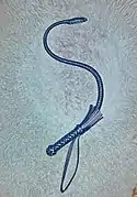 The nagaika[1] (Russian: нага́йка, pronounced [nɐˈɡajkə]) is a short, thick whip with round cross-section used by Cossacks, borrowed from Nogai people, hence the original name "nogaika", or "Nogai's whip".[2] It is also called камча, kamcha from the Turkic word "kamci" for "whip". The latter word is also used for short whips of Central Asian origin.