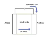 The anode and cathode have two different chemical potentials, which depend on the reactions that occur at either terminus. The electrolyte can be a solid or a liquid, referring to a dry cell or wet cell respectively and is ionically conductive.[7] The boundary between the electrode and electrolyte is called the solid-electrolyte interphase (SEI). An applied voltage across the electrodes causes the chemical energy stored in the battery to be converted to electrical energy.