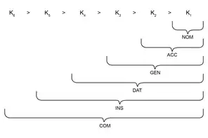 Morphological containment relates to the hierarchy of linear order in syntactic structures. Syncretism may reveals linear oder, but is unable to determine in which direction the linear order occurs. This is where morphological containment is required. It is used in this context to posit the hierarchy of cases. Syncretism can determine the linear order of cases is COM > INS > DAT > GEN > ACC > NOM or NOM > ACC > GEN > DAT > INS > COM, but morphological containment decides whether it is nominative or comitative initial.[15] These case features can be understood as sets of each other, where features build on top of one another, with the first feature being a singleton, but the next feature is the first and second nested within itself- and so on. These sets can be referred to as the above mentioned features. Alternatively, to simplify the nesting of the features, one can label them as K1/etc as proposed by Pavel Caha.[17] Arguments for Nominative case being the simplest and first case can be linked to its simplicity in structure and features.[17] Examples are found in natural language which suggest an order beginning with NOM and ending with COM, such as in West Tocharian, where the ACC plural ending -m is found nested in the GEN/DAT ending -mts .[15] This is a surface representation of the ordering of Case through use of nesting in Nanosyntax.