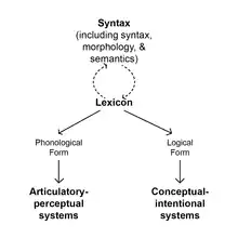 Distributed Morphology provides an alternative to Lexicalist approaches to how the lexicon and syntax interact, that is, with words independently created in the lexicon and then organized using syntax. In Distributed Morphology, the lexicon does not function independently and is instead distributed across many linguistic processes.[7] Both Distributed Morphology and Nanosyntax are late insertion models, meaning that syntax is viewed as a pre-lexical/phonological process, with syntactic categories as abstract concepts.[4] Additionally, both theories see syntax as responsible for both sentence- and word-level structure.[4][8] Despite their many similarities, Nanosyntax and Distributed Morphology still differ in a few key areas, particularly with regards to the architecture of how they theorize grammatical domains interacting. Distributed Morphology makes use of a presyntactic list of abstracted roots, functional morphemes, and vocabulary insertion which follows syntactic processes. In contrast, Nanosyntax has syntax, morphology, and semantics working simultaneously as part of one domain which interacts throughout the syntactic process to apply lexical elements (the lexicon is a single domain in Nanosyntax, while it is spread over multiple domains in Distributed Morphology).[4] See the section Tools of Nanosyntax below for more information.