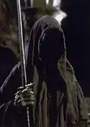 In The Lord of the Rings film trilogy (2001–2003) by Peter Jackson, the Nazgûl are almost always concealed by cloaks; they attack the inn at Bree themselves.[19] During the siege of Minas Tirith, the Witch-king wears a distinctive helmet over his hood resembling a mask and a crown, rather than the crown worn underneath his hood in the book.[20] Their shrieks are distorted recordings of producer and screenwriter Fran Walsh's scream.[21]