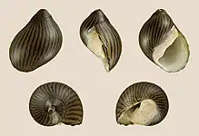 ![]() Abapertural view of a shell of Neritina turrita. Scale bar is 10 mm. |