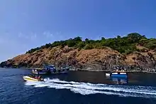 Netrani (historically known as Pigeon Island and also Heart Shape Island)[1] is a small island of India located in the Arabian Sea. It is off the coast of Karnataka situated approximately 10 nautical miles (19 km) from the temple town of Murudeshwara in Bhatkal Taluka. The island can be seen from the main coast over 15 km away, including from various beaches in Bhatkal city as well as from the Murudeshwar Beach. Views above give this island the appearance of being heart-shaped. Besides pigeons, the other inhabitants of the island are wild goats. This island has scuba diving facilities and the place is easily accessible from Bhatkal, Mangalore, Goa, Mumbai or Bangalore. There are dive shops at Murdeshwara and Goa, that regularly organize diving trips to the island.[2] This place is Locally in Bhatkal city known as Nitra Gudo. A famous Hindu Temple also located here named Jai Bajrangbali Temple and it is dedicated to the supreme hindu god Hanuman who is also known as Bajrangbali. There is a story behind this temple is that When God Hanuman Flying to the Sri Lanka that time they landed on this island and rested for a while and make a small structure of Lord Rama with soil, this story found in Vadvanal Strotram dedicated to Hanuman by the brother of Ravana , Vibhishana