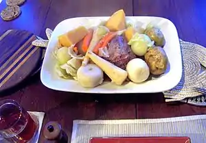 A New England boiled dinner is a traditional New England meal, consisting of corned beef with cabbage and one or more root vegetables, such as potatoes, rutabagas, parsnips, carrots, turnips, or onions.[1] The leftovers are traditionally diced and fried into “red flannel hash” for breakfast the next day.[2] The dish resembles boiled beef from English cuisine, as well a similar Newfoundland dish called a "Jiggs dinner".