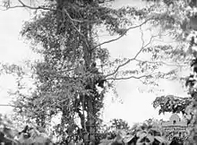 The air warning system was set up so that the inner perimeter stations were under RAAF control, while the outer stations were supervised by the Royal Australian Navy (RAN). In addition, there were a number of spotter stations set up and manned by the New Guinea Volunteer Rifles, as well as a few civilian stations reporting to ANGAU.[4] In March the crew of a shot-down Japanese bomber were engaged from an observation post at Gona by a team of spotters, resulting in the killing of the first Japanese in Papua by Australian ground forces. Working with Kanga Force, a network was set up around Wau in May.[1] For three weeks in June 1942, spotters manned an observation post in a tree just 300 yards (270 m) from the Japanese airstrip at Salamaua.[5][8] Spotter Ross Kirkwood was photographed by Damien Parer in this post with an agreement not to release the pictures. Yet the photos were soon published in a newspaper in Sydney and the observation post was attacked by the Japanese the day after, with Kirkwood forced to make a narrow escape. In July 1942, the Buna station reported the landing of Japanese forces in Papua, an event which marked the commencement of the Kokoda Track Campaign.[1]