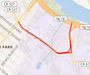 Route 172 is a short state highway in New Brunswick, New Jersey, United States. The designation runs along the southernmost leg of George Street, which is county and city-maintained the rest of the way. Route 172 is 0.69 miles (1.11 km) long, serving as a connector from an intersection with County Route 527 (CR 527) and Paul Robeson Boulevard to an interchange with Route 18. The highway was assigned in the 1950s, when nearby Route 18 was realigned onto a new freeway over Burnet Street in New Brunswick. Route 172 underwent a major upgrade during the reconstruction of Route 18, including a roundabout at an intersection with CR 617, and a brand-new interchange with the local lanes of Route 18.