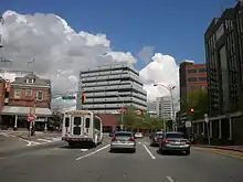 The route splits from Somerset Street and heads entirely into New Brunswick, Middlesex County along French Street. At the Sandford Street intersection, Route 27 becomes a county-maintained road that is also signed as County Route 644. It then intersects County Route 693 (Jersey Avenue), which heads to the southwest to become Route 91. Past this intersection, the route becomes a two-lane street that heads into downtown New Brunswick, south of the main campus of Rutgers University. Here, the route has a daily traffic count of approximately 11,559 vehicles. It crosses under Amtrak's Northeast Corridor rail line adjacent to the New Brunswick station serving Amtrak and NJ Transit's Northeast Corridor Line.[1][2] The route turns into a four-lane divided highway and intersects County Route 527 (Easton Avenue). At this point, County Route 644 ends, with Route 27 forming a brief concurrency with County Route 527, heading east along Albany Street as a city-maintained street. About 200 yards (180 m) later, the road crosses George Street, which heads to the north as County Route 672 and to the south as Route 171. County Route 527 splits from Albany Street by heading south on Route 171 while Route 27 continues east. After another 0.2 miles (320 m), Route 27 intersects with County Route 514, Johnson Drive. Route 27 continues along Albany St. as a concurrency with County Route 514. It immediately interchanges with Route 18 (Memorial Parkway). At the Route 18 interchange, Route 27 becomes state-maintained again, crossing the Raritan River on the Albany Street Bridge into Highland Park.[1]