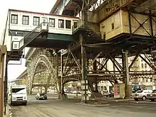 About 40% of the subway system runs on surface or elevated tracks, including steel or cast iron elevated structures, concrete viaducts, embankments, open cuts and surface routes.[80] As of 2019, there are 168 miles (270 km) of elevated tracks.[81] All of these construction methods are completely grade-separated from road and pedestrian crossings, and most crossings of two subway tracks are grade-separated with flying junctions. The sole exceptions of at-grade junctions of two lines in regular service are the 142nd Street[82] and Myrtle Avenue junctions, whose tracks intersect at the same level, as well as the same-direction pairs of tracks on the IRT Eastern Parkway Line at Rogers Junction.[83][84]