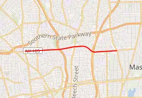 New York State Route 105 (NY 105) is a 3.41-mile (5.49 km) state highway located within Nassau County, New York, in the United States. It begins in the town of Hempstead at an intersection with NY 106 in North Bellmore that also serves as that route's southern terminus. From here, it runs east through North Wantagh to an interchange with NY 135 before crossing into the town of Oyster Bay and ending at a junction with NY 107 in Massapequa. Jerusalem Avenue continues west past the route's western terminus as a county-maintained road to Hempstead and east as a town road to Massapequa State Park. NY 105 was assigned in the early 1930s.
