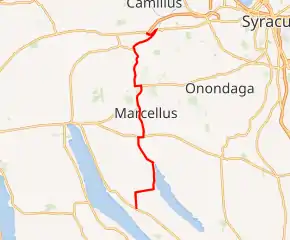 In 1855, the road from Marcellus to Camillus along the Nine Mile Creek route was improved by the Camillus and Marcellus Plank Road Company, which was first chartered in 1849, and in 1853 were authorized to collect tolls from travelers using the road.[11] The improvement of the road led to it becoming a stagecoach route in the middle of the 19th century.[12] The former plank road alignment in the village of Marcellus (North Street) and the southward continuation along Cherry Street (now South Street) was paved in 1911 as part of the construction of a new state highway that would pass through the town.[13][14]