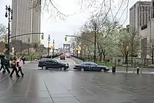 In December 1954, during a renovation of City Hall, the office of now-mayor Wagner temporarily moved from City Hall to the World Building.[115] Demolition work on the World Building started in mid-March 1955, and the last commercial tenants were required to leave by April 1. The mayor's office planned to stay in the building until May 1, so mayoral aides arranged for demolition contractors to conduct only minor facade removals until then. In preparation for the construction of the new ramps, the demolition contractors would also strengthen the World Building's foundations.[116] The mayor's office, the last tenant of the World Building, moved back to City Hall on May 13, 1955.[117] The site was mostly cleared by the beginning of 1956,[118] and work on the new Brooklyn Bridge approaches began later that year.[119]