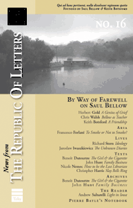 News from the Republic of Letters is the third magazine collaboration between Saul Bellow and Keith Botsford, following Noble Savage and ANON. The journal, originally based in Boston and now operated from the editor's home in Costa Rica, publishes new and newly discovered writings from American and international writers. The magazine appears twice a year at widely varying intervals; subscribers purchase one issue at a time or a subscription for four issues. It first appeared in 1997 in newsprint; issues between 2003 and 2008 were published in bound edition; with the publication of No. 19 by the London-based publisher Sylph Editions, the journal has returned to broadsheet format.